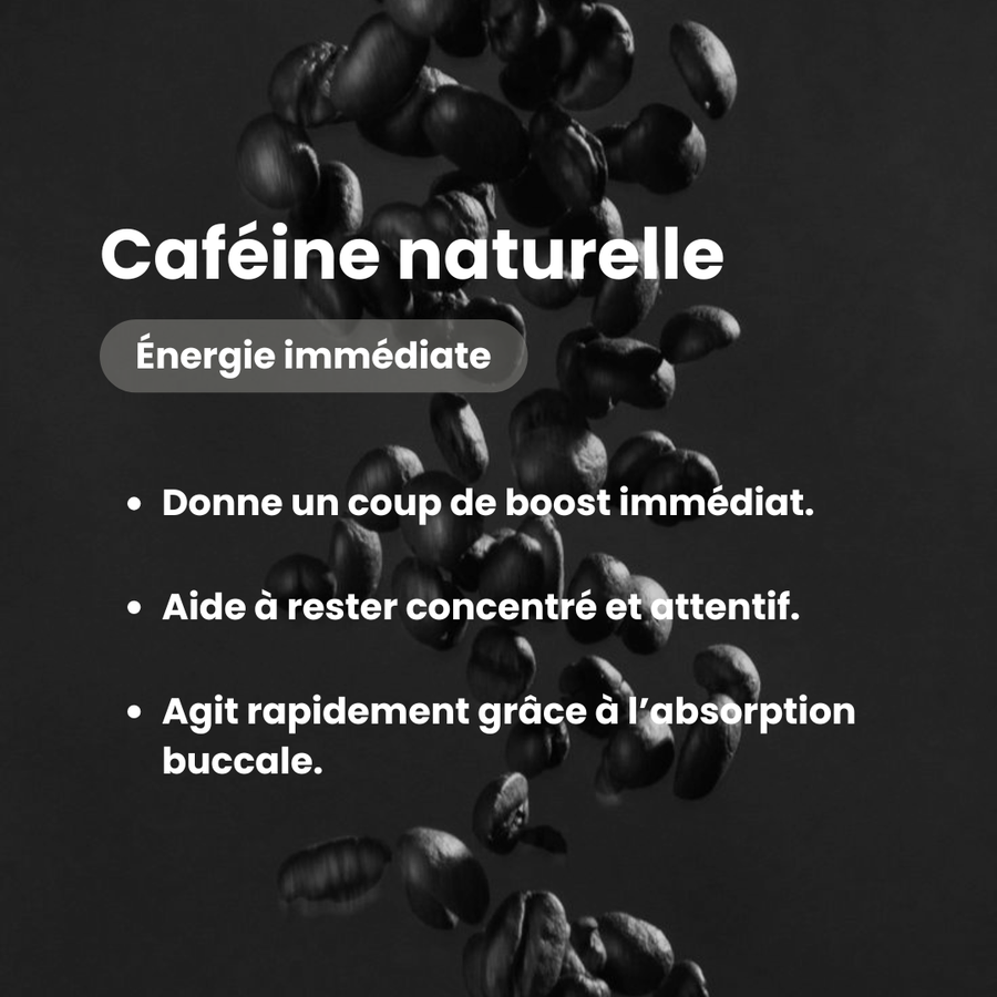 La caféine agit rapidement par absorption buccale. On ressent un regain d’énergie, plus de vigilance et la fatigue s’estompe, idéal pour se remettre dans le rythme.