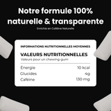 Nos gommes sont formulées à partir d’ingrédients simples et naturels, sans sucre, vegan et sans additifs superflus. La caféine utilisée est d’origine naturelle et sélectionnée pour sa pureté et son efficacité, avec une traçabilité claire et des dosages transparents (130 mg par gomme). L’objectif : vous offrir un produit performant, sûr et clean, qui agit rapidement quand vous en avez besoin.